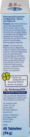 Zutaten: Calciumcarbonat, Magnesiumoxid, Magnesiumcarbonat, Füllstoff mikrokristalline Cellulose, Trennmittel Magnesiumsalze der Speisefettsäuren, Polyethylenglycol und Talkum; Füllstoff Sorbit, Überzugsmittel Hydroxypropylmethylcellulose, Cholecalciferol (Vitamin D3), Stabilisator Hydroxypropylcellulose, modifizierte Stärke, pflanzliches Öl (Kokos).